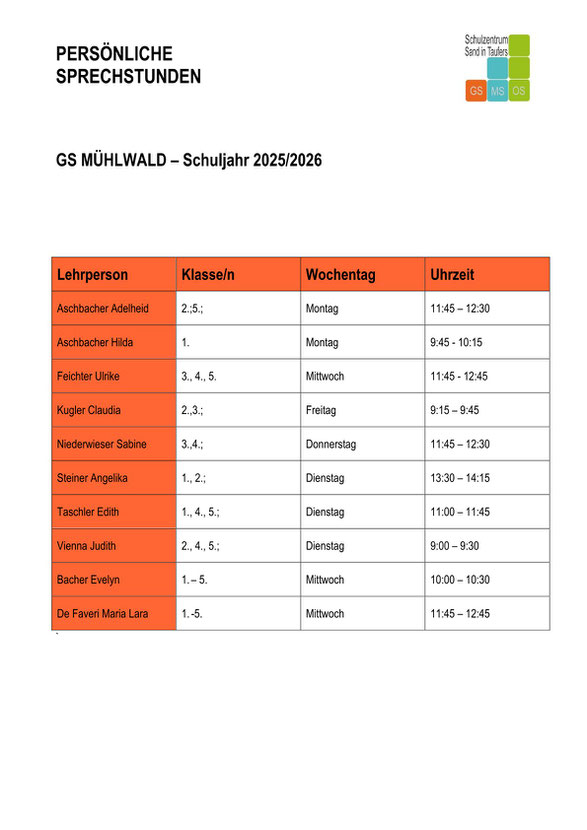 Unterrichtszeit/Fächer/Persönliche Sprechstunden Lp
