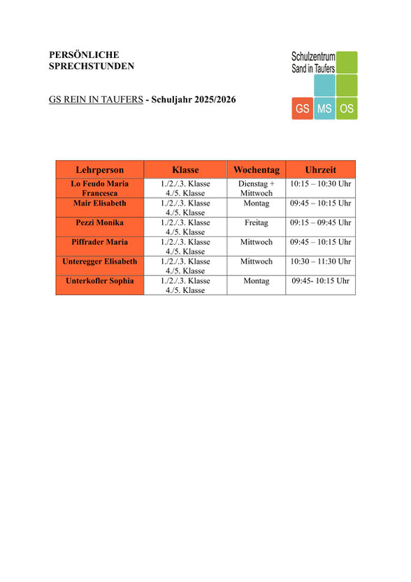 Unterrichtszeit/Fächer/Persönliche Sprechstunden Lp