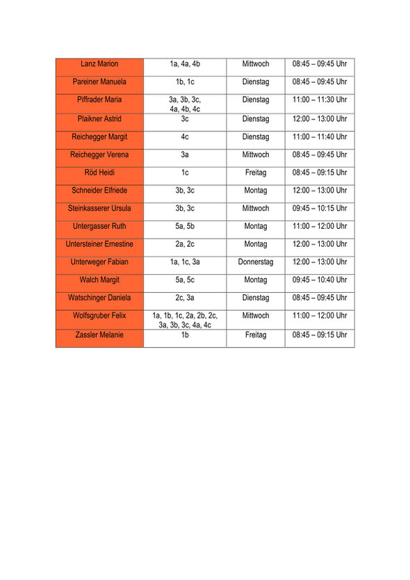 Unterrichtszeit/Fächer/Persönliche Sprechstunden Lp